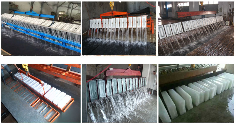 鹽水池塊冰機以鹽水作為熱交換的媒介。鹽水制冰機組先給鹽水降溫降到零下十幾度,零下十幾度的鹽水再給冰桶里面的淡水凍結成冰,冰塊尺寸根據冰桶尺寸調節(jié)。脫冰方式需要行車將冰桶吊起,放入融冰池脫模,塊冰表面融化,通過倒冰架將冰塊倒出。
