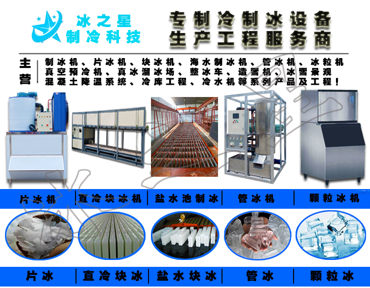 深圳市冰之星制冷科技有限公司是一家集制冰制冷設備設計研發、生產和銷售為一體的綜合高科技制冰制冷公司。公司主要經營:制冰機、片冰機、塊冰機、冰磚機、條冰機、鹽水式塊冰機、直冷式塊冰機、海水船用制冰機、管冰機、冰粒機、方冰機、真空預冷機、真冰溜冰場、整冰車、造雪機、室內滑雪場、冷庫工程、冷水機、混凝土冷卻系統、制冰機蒸發器、集裝箱制冰機、冰蓄冷空調等系列產品及工程!