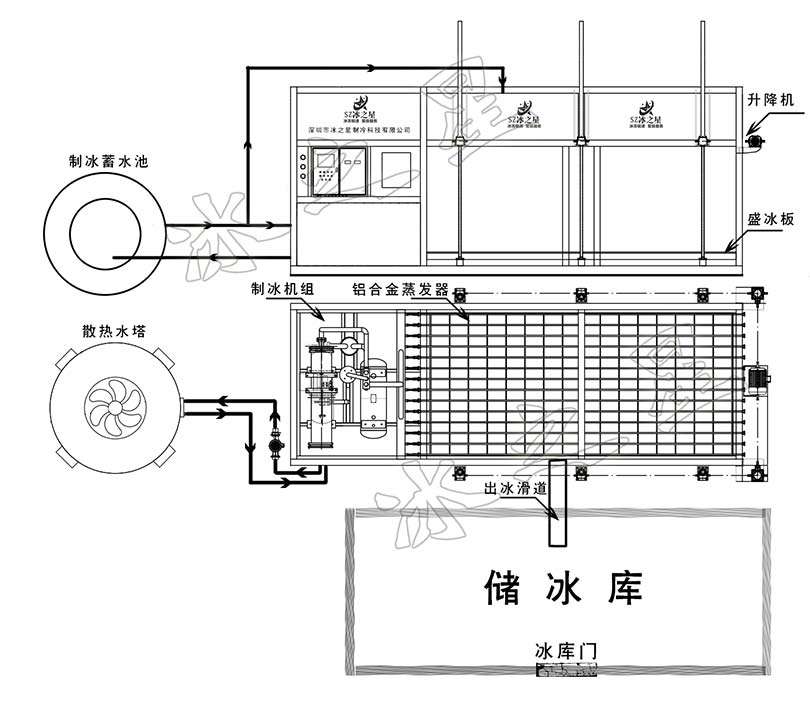 F、脫冰迅速快:水凍結(jié)成冰后,制冰系統(tǒng)反向加熱,熱氟進(jìn)入蒸發(fā)器脫冰,脫冰速度快;脫冰后直接落在冰輸送裝置上,無需行車等取吊設(shè)備;