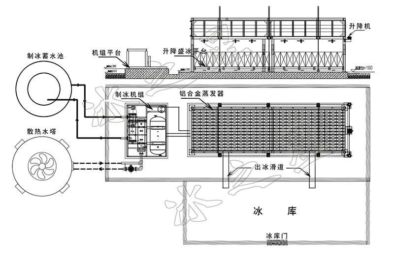 F、脫冰迅速快:水凍結成冰后,制冰系統反向加熱,熱氟進入蒸發器脫冰,脫冰速度快;脫冰后直接落在冰輸送裝置上,無需行車等取吊設備;